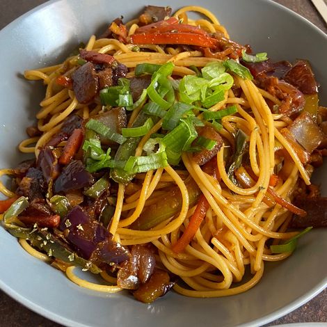 Deliciosos espaguetis asiáticos aptos para veganos. Buena receta para una comida saludable y sabrosa. 😋