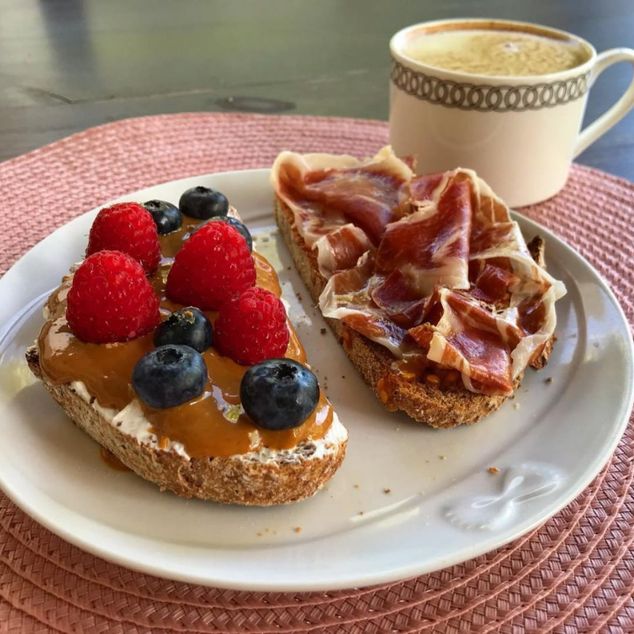 - Tostada con 🥛Crema de queso (Philadelphia u otra marca), 🥜Crema de cacahuete 100%, 🍓Frambuesas y 🍇Arándanos. (Está brutal 🤤)