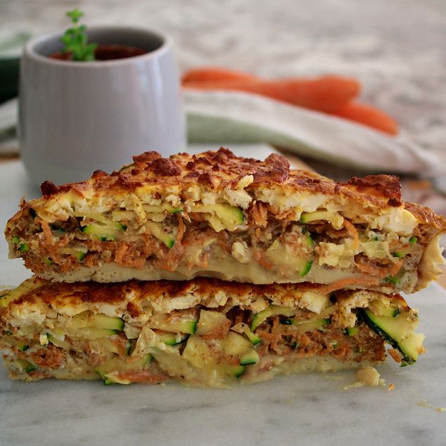 Pasamos la mezcla a un molde y ponemos por encima el queso feta desmenuzado.
