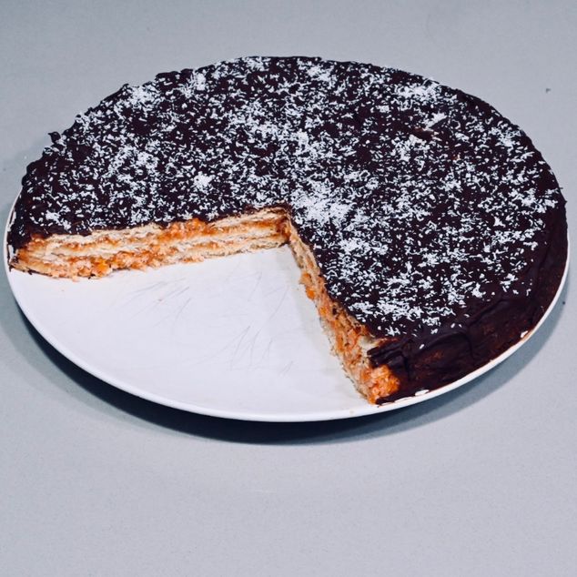 Primero, cocemos las zanahorias hasta que estén tiernas y se puedan aplastar fácilmente con un tenedor. Luego, las trituramos con un tenedor hasta obtener una pasta y la mezclamos con el azúcar y el coco. A continuación, preparamos un molde desmontable y colocamos una capa de galletas María en su interior. Cubrimos las galletas con una capa de la mezcla de zanahoria y repetimos este proceso hasta agotar la mezcla y las galletas. Refrigeramos durante un tiempo y luego desmoldamos el pastel sobre un plato.
