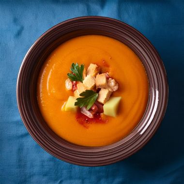 Para servir, distribuye el salmorejo en tazones individuales y, si lo deseas, puedes decorarlo con huevo duro picado y trozos de jamón. Personalmente, de vez en cuando lo decoro con unos trocitos de melón que le dan un toque fresco y unas hojas de perejil.