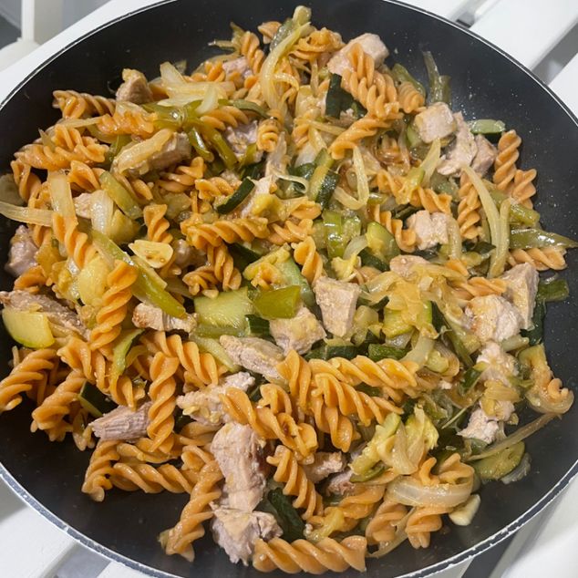 Receta fácil, saludable, deliciosa y muy saciante. Wok de verduras con pasta de lentejas y solomillo de cerdo. 🍃🫑🧄🧅🧑🏼🍳